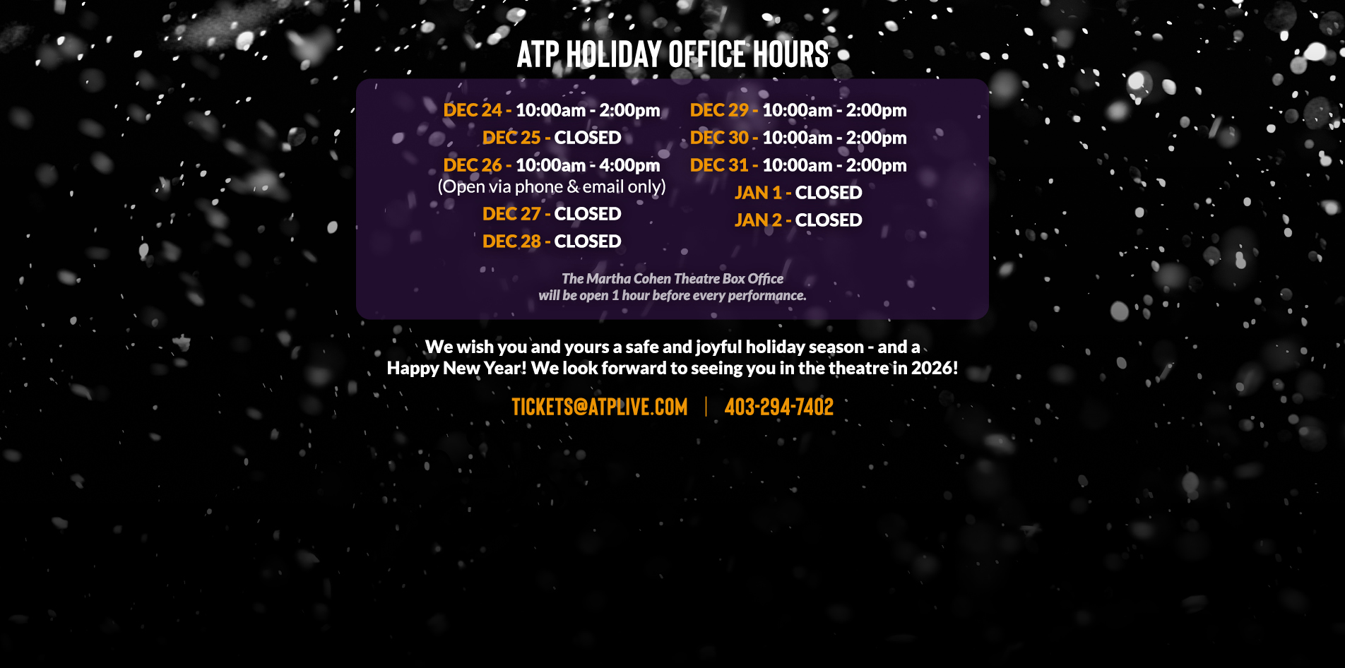 Alberta Theatre Projects has been a cornerstone of Calgary’s arts community for five decades, showcasing the best in live theatre and fostering a vibrant cultural hub for audiences of all ages. With a commitment to artistic excellence and community engagement, ATP continues to inspire, entertain, and enrich the lives of theatregoers across the region.